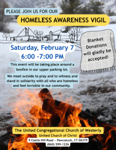 The United Congregational Church of Westerly, United Church of Christ, will host a Homeless Awareness Vigil on Saturday, February 7, from 6:00 to 7:00 PM in the church’s upper parking lot at 9 Castle Hill Road in Pawcatuck. The community is invited to gather outdoors around a bonfire for an hour of prayer, reflection, and solidarity with neighbors experiencing homelessness.